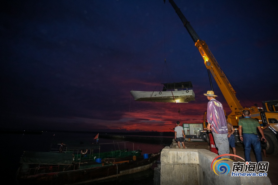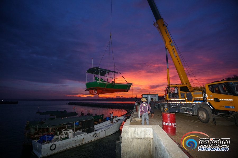 萬寧市烏場港碼頭,起重機把一艘艘漁船吊上岸避風(fēng)。海報集團全媒體中心記者 袁琛 攝