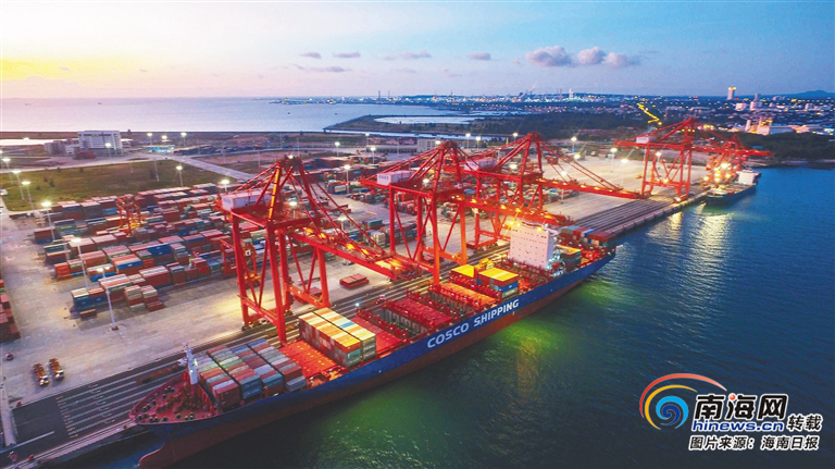洋浦港是國際陸海貿易新通道新支點。圖為載有集裝箱的巨輪??吭谘笃纸洕_發區國際港務小鏟灘碼頭。 海南日報記者 陳元才 攝