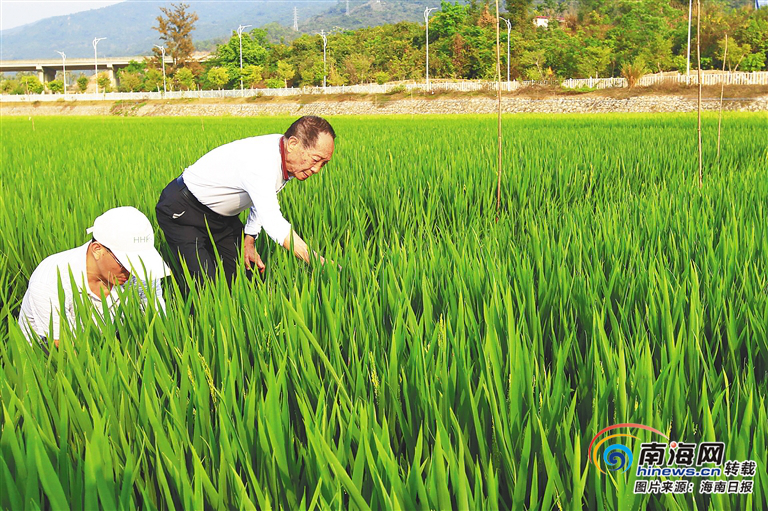 海南依托南繁科研育種基地,積極推動南繁科技城建設。圖為袁隆平(右)在南繁基地察看水稻長勢。海南日報記者 武威 攝