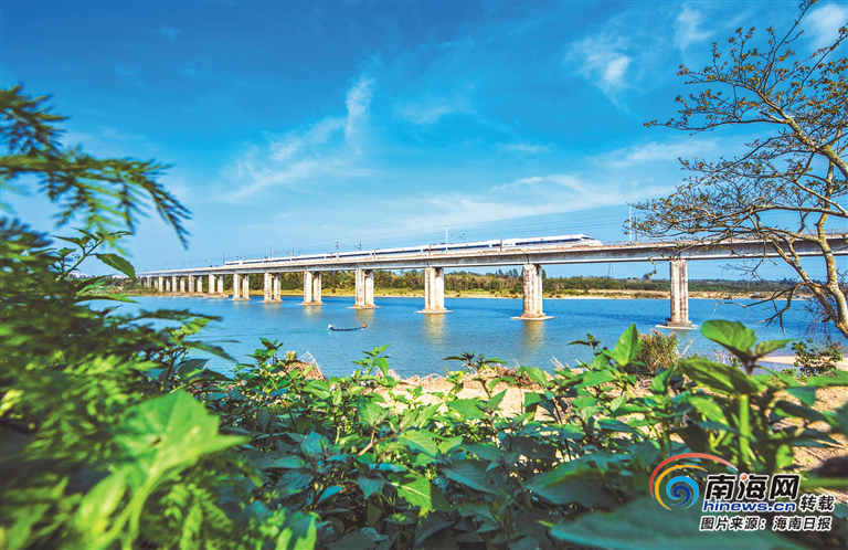 海南環島高鐵是全球唯一環島高鐵。圖為疾馳的高鐵列車從瓊海萬泉河上駛過。海南省圖片社供圖