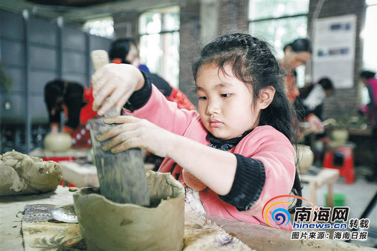 一名兒童在昌江石碌鎮保突村制陶傳習所體驗制陶工藝。 (海南日報資料圖片)
