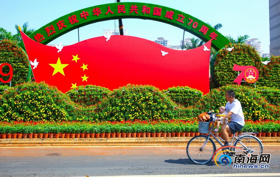 首頁 > 組圖 | 國旗鮮花扮靚海口街頭 喜迎2019年國慶到來