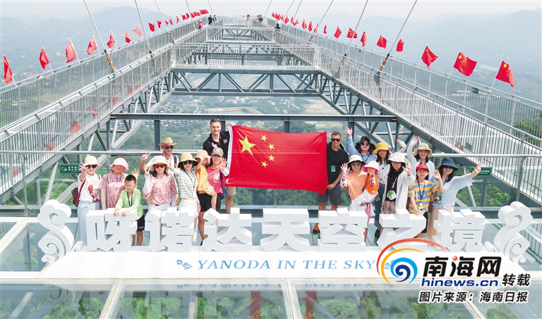 游客在海南呀諾達雨林文化旅游區的玻璃觀景平臺上感受熱帶雨林美景。