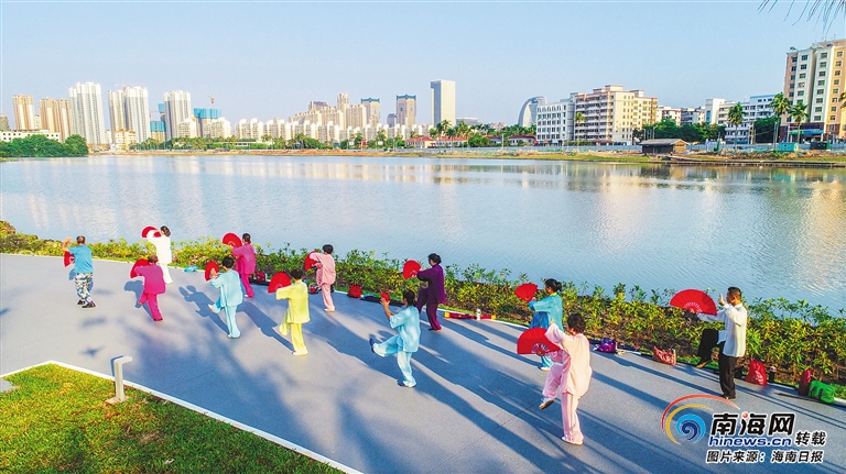 10月22日,在海口市瓊山區紅城湖公園南岸,許多晨練者在湖畔鍛煉,享受美好健康生活。
