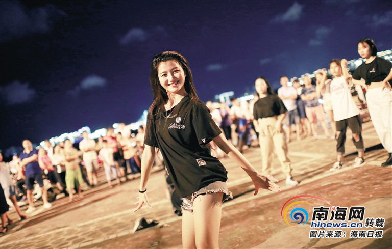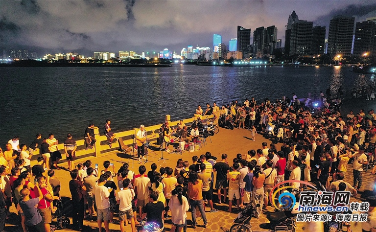 夜色中,音樂舞蹈愛好者等藝人,紛紛匯聚海口灣獻藝,成為一道獨特的風景線。海南日報記者 張杰 攝
