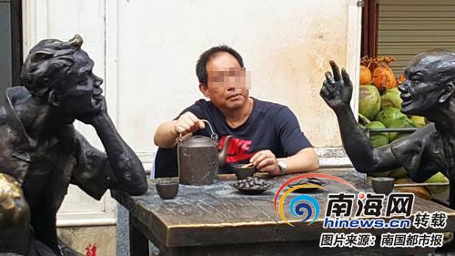 11月25日,在海口騎樓老街,一游客把老街上的雕塑茶碗當成了煙灰缸。雕塑“椰韻”和“商道”,桌上擺放著一壺茶和兩盤點心,兩個男人邊飲茶邊聊天,展現了海南本土的老爸茶文化。充滿情趣的雕塑吸引了不少前來觀看的游客。