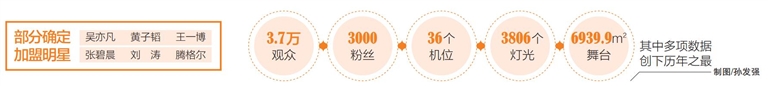 同時,3.7萬名觀眾,3000名粉絲、36個機位、3806個燈光、6939.9平方米的舞臺,其中多項數據都將創下歷年之最?!斑@表明了湖南衛視的實力和誠意?!标愳в钫f,晚會現場還有5首新歌首發,以及31首年度新歌以及18首經典改編呈現給觀眾。