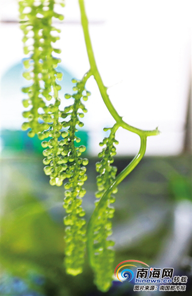 “這一串串綠色的顆粒是什么?”在文昌館內,不少觀展者圍在一處水缸前發問。工作人員告訴記者,這種植物名為“海葡萄”,學名長莖葡萄蕨藻,屬綠藻類,因外觀渾圓飽滿、如一串串晶瑩剔透的葡萄而得名。而這些美麗的綠色小顆粒散發出海味的咸鮮芳香,頗有魚子醬的神韻,所以被喻為植物中的“綠色魚子醬”。