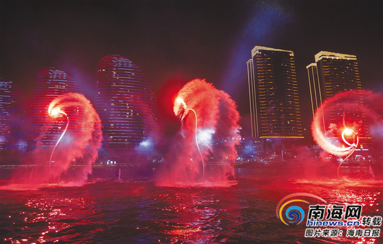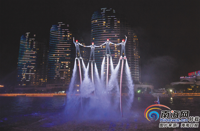 20時許,眾多游艇靜靜泊三亞港的水面上,游艇碼頭外,一個燈光絢麗、形式新穎的舞臺已搭建好在港灣中,舞臺四周散落分布水上發(fā)光球,展現(xiàn)出海洋的美妙景色。隨著主持人宣布活動開始,伴隨著富有節(jié)奏感的音樂,舞臺背后的水面上,多位“水上飛人”在短時間內(nèi)完成鯉魚騰躍式地出水、旋轉(zhuǎn)上升,又急劇下降、轉(zhuǎn)體360度鉆水等各種高難度動作。