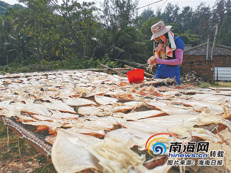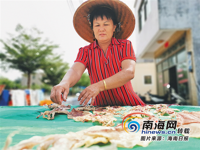 烏場的蔡月琴在曬魷魚干。海南日報記者 袁宇 攝