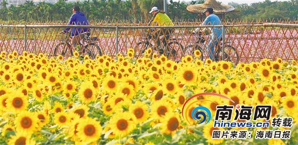 瓊海龍壽洋田野公園,游客邊騎行邊欣賞美麗花海。海南日報記者 陳元才 攝