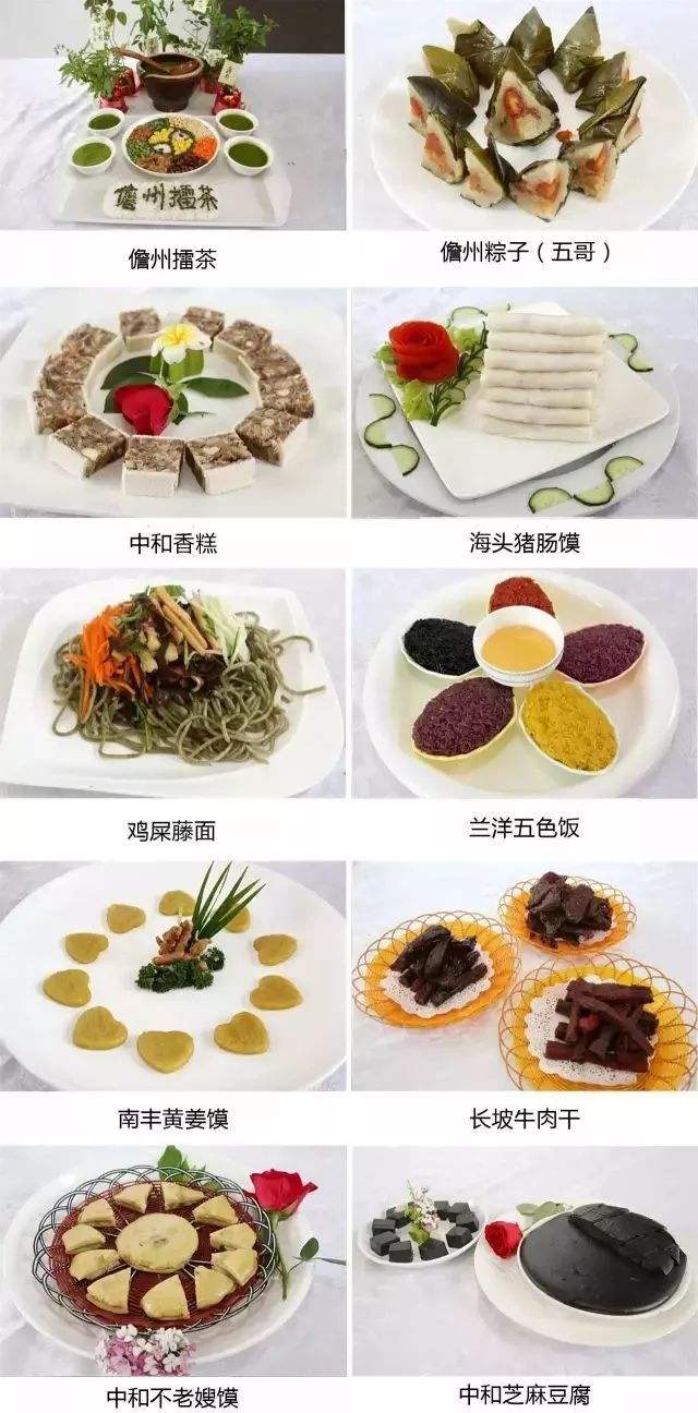 香草脆皮牛肉包、如意百花卷、海山島牛肉干、嘮葉雞蛋餅、魚茶、媽媽味道木薯餅、小機粽子、糖果酥、養生野菜丸子、脆皮小塘菜