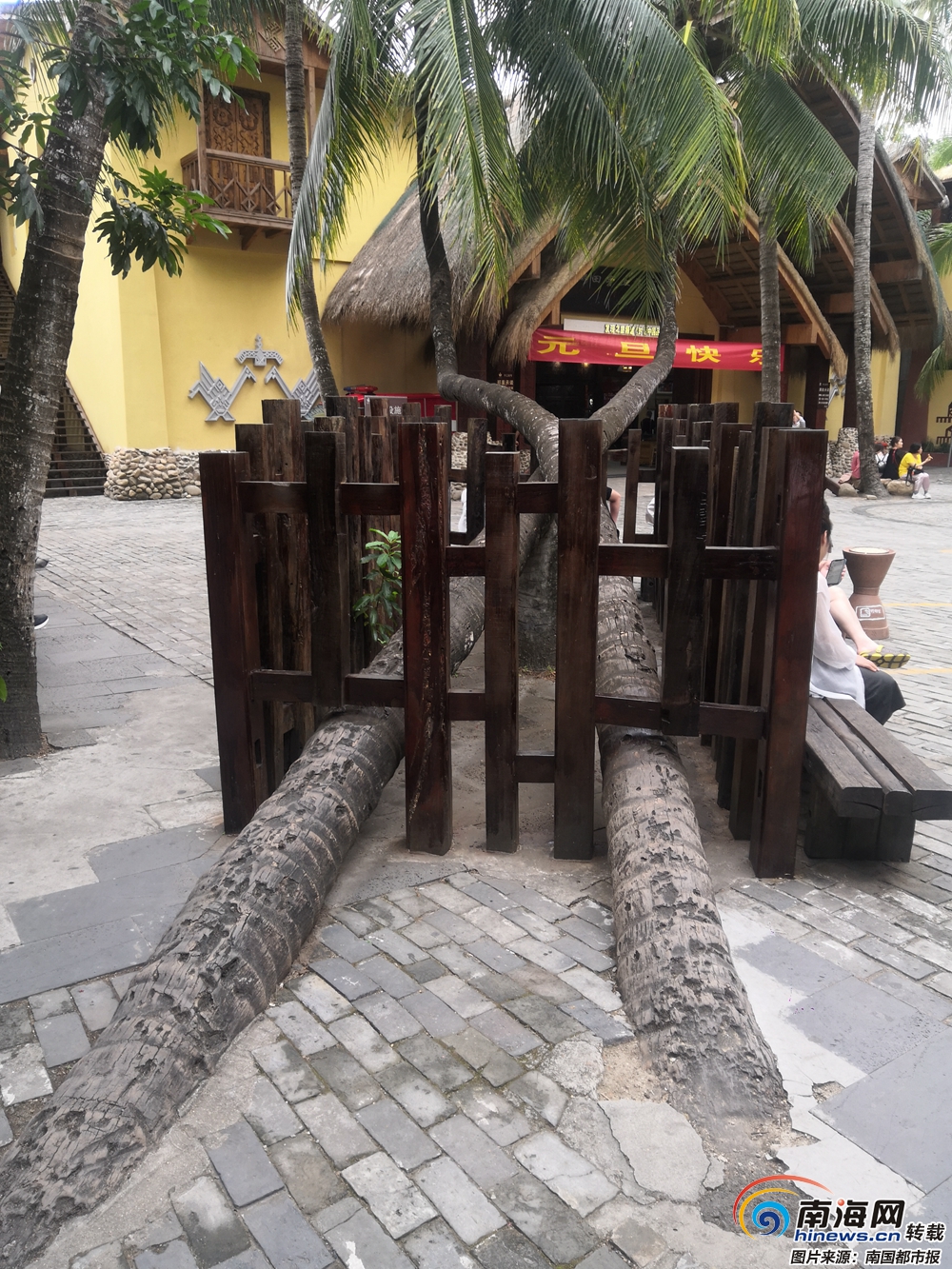 同樣令人頭痛的,還有隨意攀爬、翻越的行為。在椰田古寨,禁止攀爬的提示牌非常多,幾乎幾步一個。臺風吹歪的椰子樹成為景區一景,有的交織在一起生長,形似鴛鴦交頸,寓意美好愛情。然而,此刻的愛情樹卻被柵欄包圍。“一些游客為了拍照,竟然爬到樹干中央,非常危險,樹也被踩得傷痕累累。”椰田古寨運營副總經理吳震介紹,給愛情樹包圍上柵欄,是引導游客文明旅游的無奈之舉。