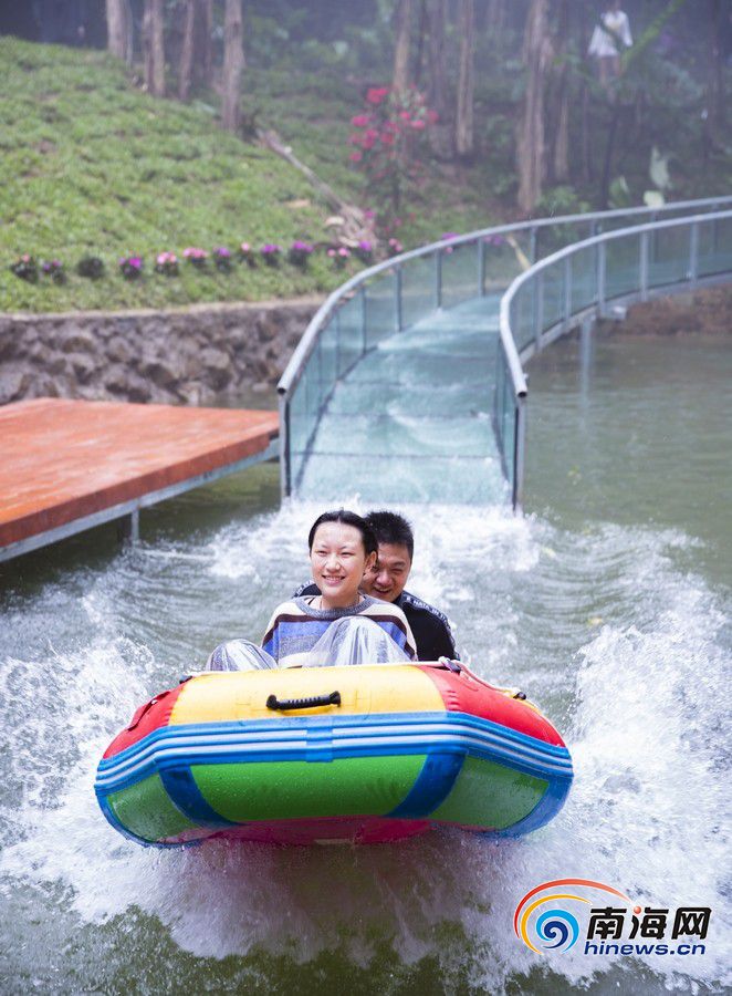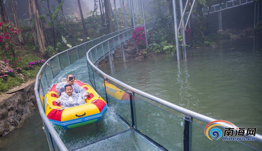 據了解,瓊中百花嶺熱帶雨林高空漂流項目全長2020米,落差約百丈,設有4處360度的雙層環形盤旋、15處S形彎道和一處9D恐龍主題聲光電秀,透明無邊的全視野設計,不僅可以讓游客體驗到高空呼嘯而過的快感,還能換一種角度欣賞到熱帶雨林的獨特魅力。滑道全程采用8cm特制鋼化玻璃,低水位設計讓水流和船體自然分離,顛覆傳統河道漂流模式,可實現漂流不濕身。