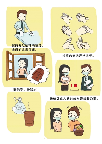 保持辦公區環境清潔,建議每日通風3次,每次20-30分鐘,通風時注意保暖。人與人之間保持1米以上距離,多人辦公時佩戴口罩。保持勤洗手、多飲水,堅持在進食前、如廁后按照六步法嚴格洗手。接待外來人員雙方佩戴口罩。