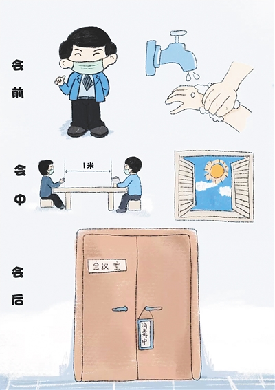 建議佩戴口罩,進入會議室前洗手消毒。開會人員間隔1米以上。減少集中開會,控制會議時間,會議時間過長時,開窗通風1次。會議結束后場地、家具須進行消毒。茶具用品建議開水浸泡消毒。(內容均來自中國人口出版社出版的《新型冠狀病毒感染肺炎防控漫畫》)