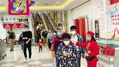 記者走訪發(fā)現(xiàn),市民戴口罩進(jìn)入超市和商場前,都需要出示健康碼,經(jīng)工作人員測量體溫為正常后才能進(jìn)入。3月4日14時許,在明珠廣場旺豪超市門口,記者看到不少工作人員正在教一些老人如何出示健康碼。前去大潤發(fā)龍昆南店購物的市民,在門口排起長隊(duì)有序進(jìn)場。超市內(nèi)蔬菜、水果、肉類較為充足,不少市民在肉類區(qū)選購。