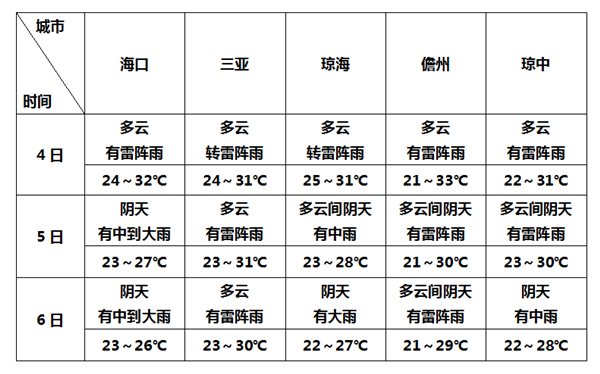 預(yù)計4日夜間~6日,受弱冷空氣影響,海南島大部分地區(qū)有陣雨或雷陣雨,局地暴雨,其中五指山以北局部地區(qū)伴有雷雨大風(fēng)和短時強降水等強對流天氣;各地氣溫下降,6日全島最高氣溫26~29℃,最低氣溫20~23℃。