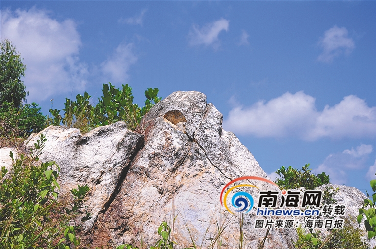 在村口,60多歲的王明全老伯知道我們的來(lái)意后顯得很高興,主動(dòng)帶路。穿過(guò)幾條野草沒(méi)膝的小路,我們來(lái)到了一座看起來(lái)不是很高的山下。王老伯說(shuō):“前面就是白石山了。”透過(guò)樹(shù)枝空隙,在藍(lán)天白云的襯托之下,山的頂部,幾塊大石在陽(yáng)光照耀下泛出白色光芒,顯得特別醒目。走上一道小堤壩,沒(méi)用幾分鐘,就來(lái)到了山頂。站在這座曾經(jīng)名叫“瓊山”的山上,天很藍(lán),似乎伸手就可以摘到幾朵白云。