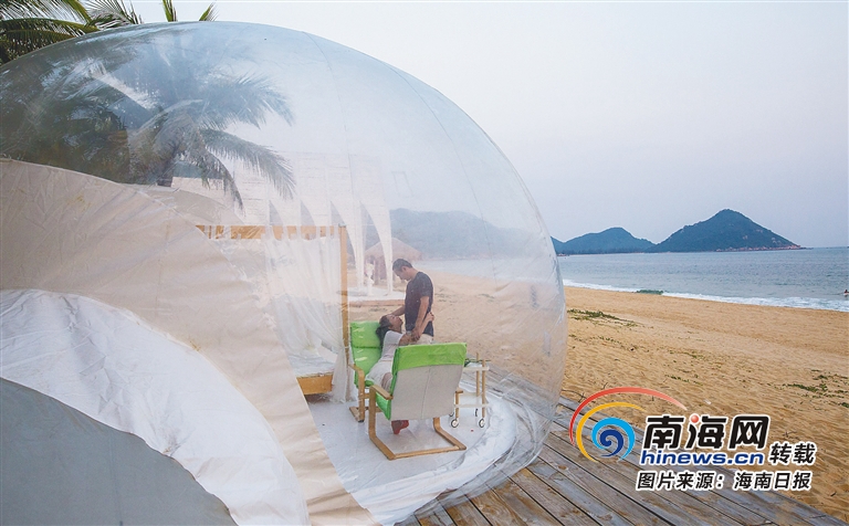 游客在陵水南灣猴島生態(tài)旅游區(qū)二期項(xiàng)目呆呆島的泡泡屋中拍攝寫(xiě)真。 武昊 攝