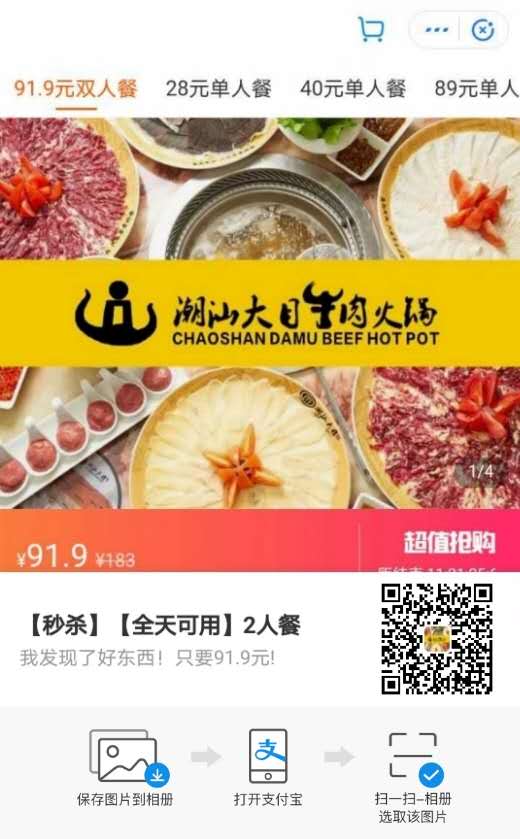 二、打開支付寶APP【口碑】搜索“潮汕大目牛肉火鍋”,進入商家頁面,原價183元的雙人套餐,享有五折優惠,現只需91.9元即可購買!