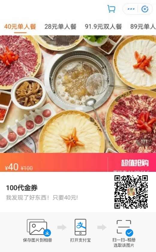 一、打開支付寶APP【口碑】搜索“潮汕大目牛肉火鍋”,進入商家頁面,即可購買到40元代100元的代金券,每桌限用一張。