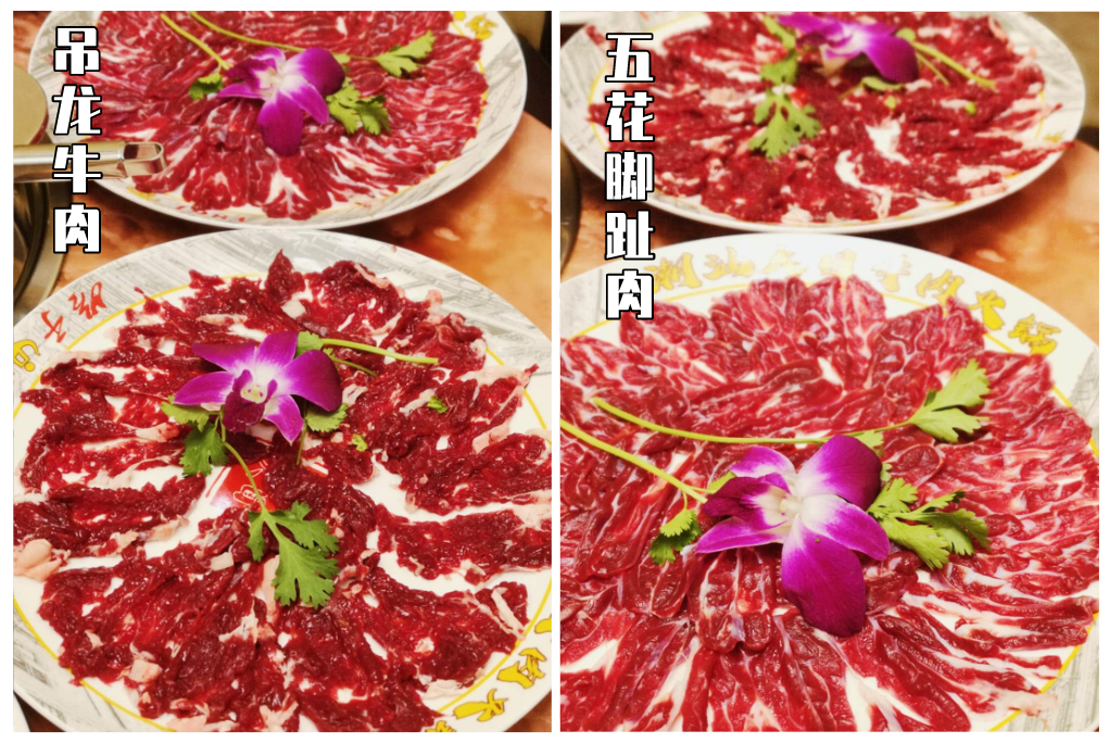 吊龍牛肉的肉質彈牙爽口、油脂飽滿鮮甜,是牛肉火鍋的必點肉;五花腳趾肉的肉質偏瘦,嫩度適中,三上三下涮熟就能聞到香氣四溢,幾秒就足以享受一番。