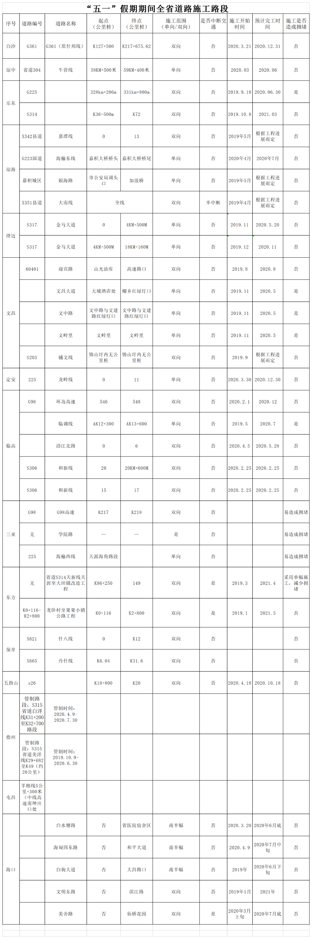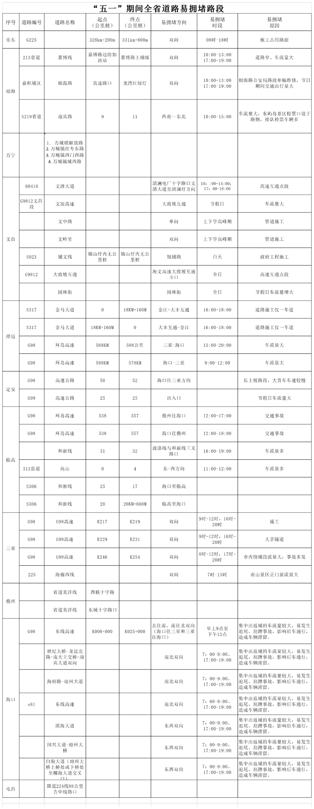 “五一”期間全省道路易擁堵路段及道路施工路段