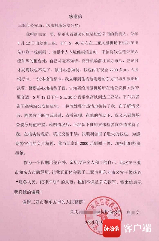 新海南客戶端、南海網(wǎng)、南國都市報(bào)5月23日消息(記者 利聲富 通訊員 何岸樺)日前,三亞市公安局鳳凰機(jī)場分局候機(jī)樓派出所民警熱心幫游客唐先生找回7000多元現(xiàn)金及銀行卡等物品,婉拒唐先生2000元酬謝。為感謝民警,唐先生寫了一封感謝信給他們,表達(dá)他的謝意。
