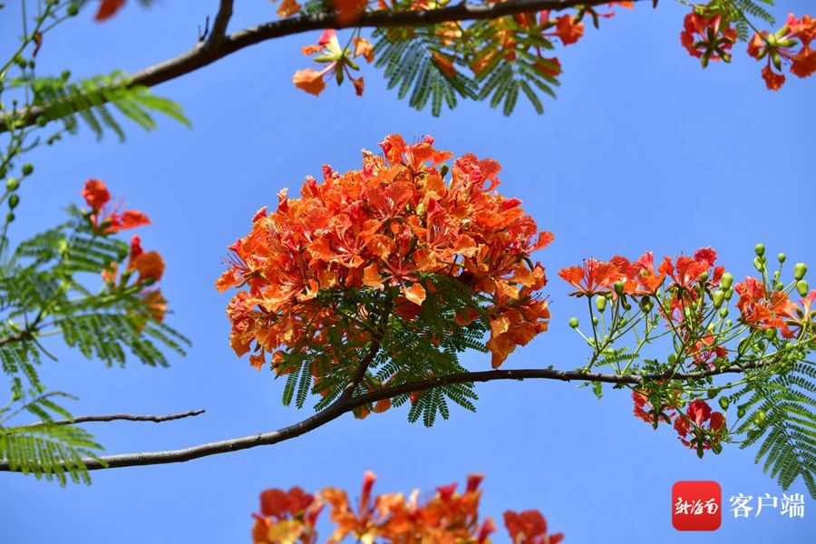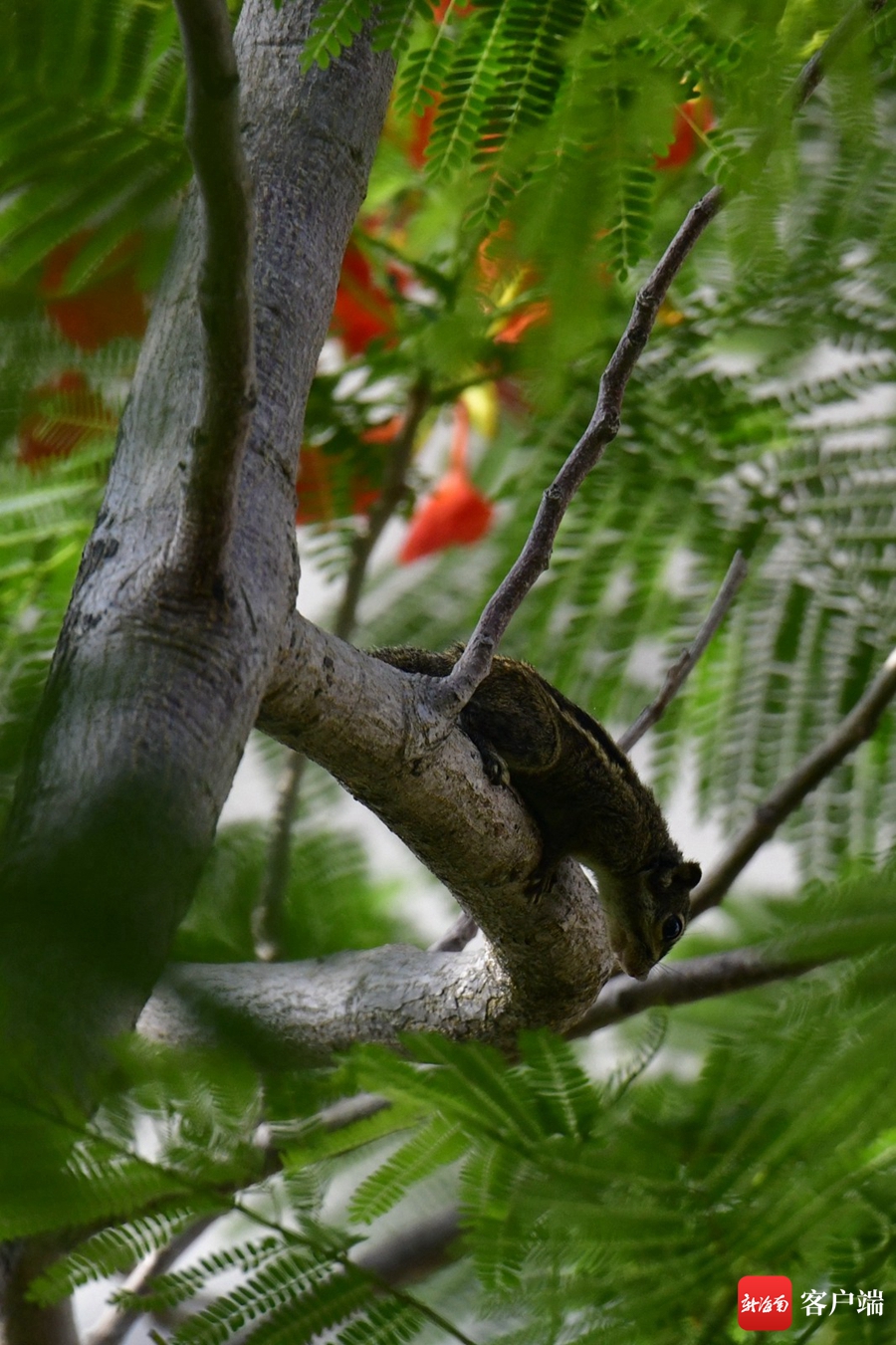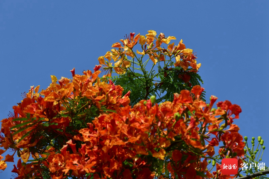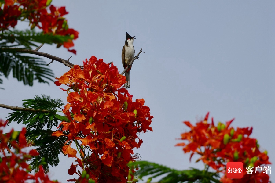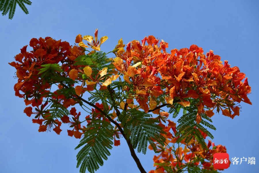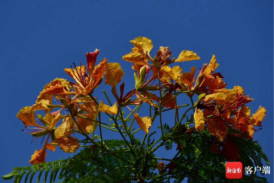 近日,記者在海口街頭拍到黃色的鳳凰花,這棵鳳凰樹所開的鳳凰花和平日所見的鳳凰花不同,它既有紅色,也有黃色。現在正值鳳凰花盛花期,常有小鳥和松鼠在樹上棲息。
