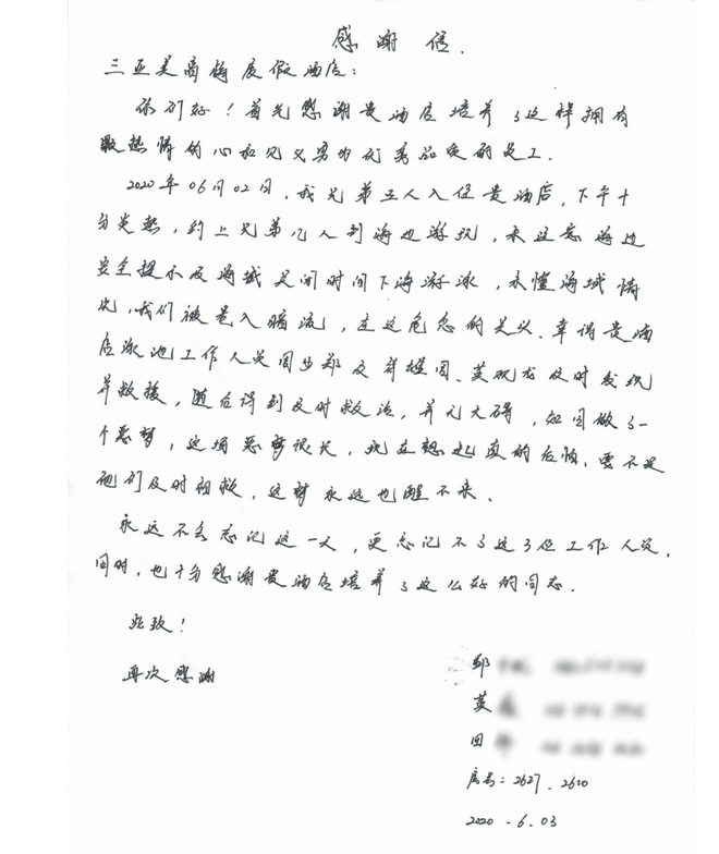 被救后,4名來自江西的游客抱著黃觀龍等人一個(gè)勁地道謝地說。離開三亞時(shí),他們給酒店寫了一封感謝信和贈(zèng)送一面錦旗表達(dá)他們由衷的謝意。