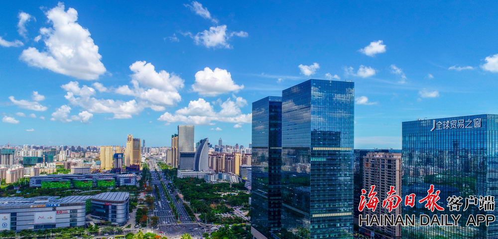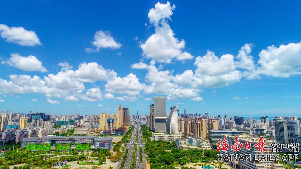 在藍天白云下,海南日報記者高空航拍夏日里海口國興大道景色,海口“藍”美景盡收眼底。