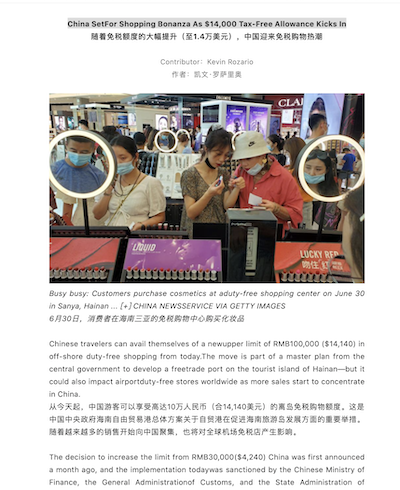 一篇以《隨著免稅額度的大幅提升(至1.4萬美元),中國迎來免稅購物熱潮》為標題的報道在《Forbes》上刊登,作者凱文·羅薩里奧介紹了海南免稅購物新政的內(nèi)容,包括每人每年購物額度由3萬元提升至10萬元,免稅商品種類由38種擴大至45種。