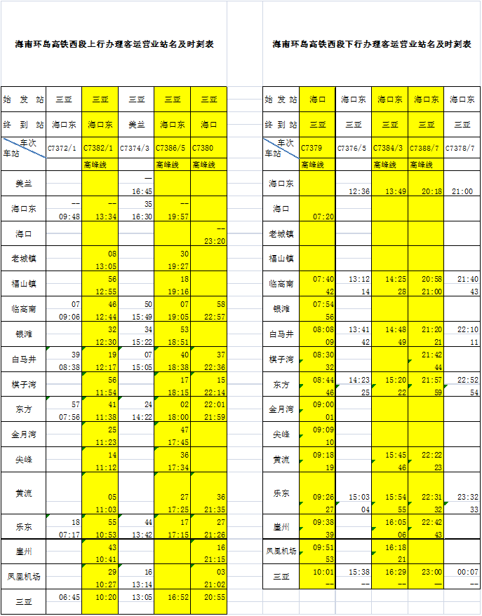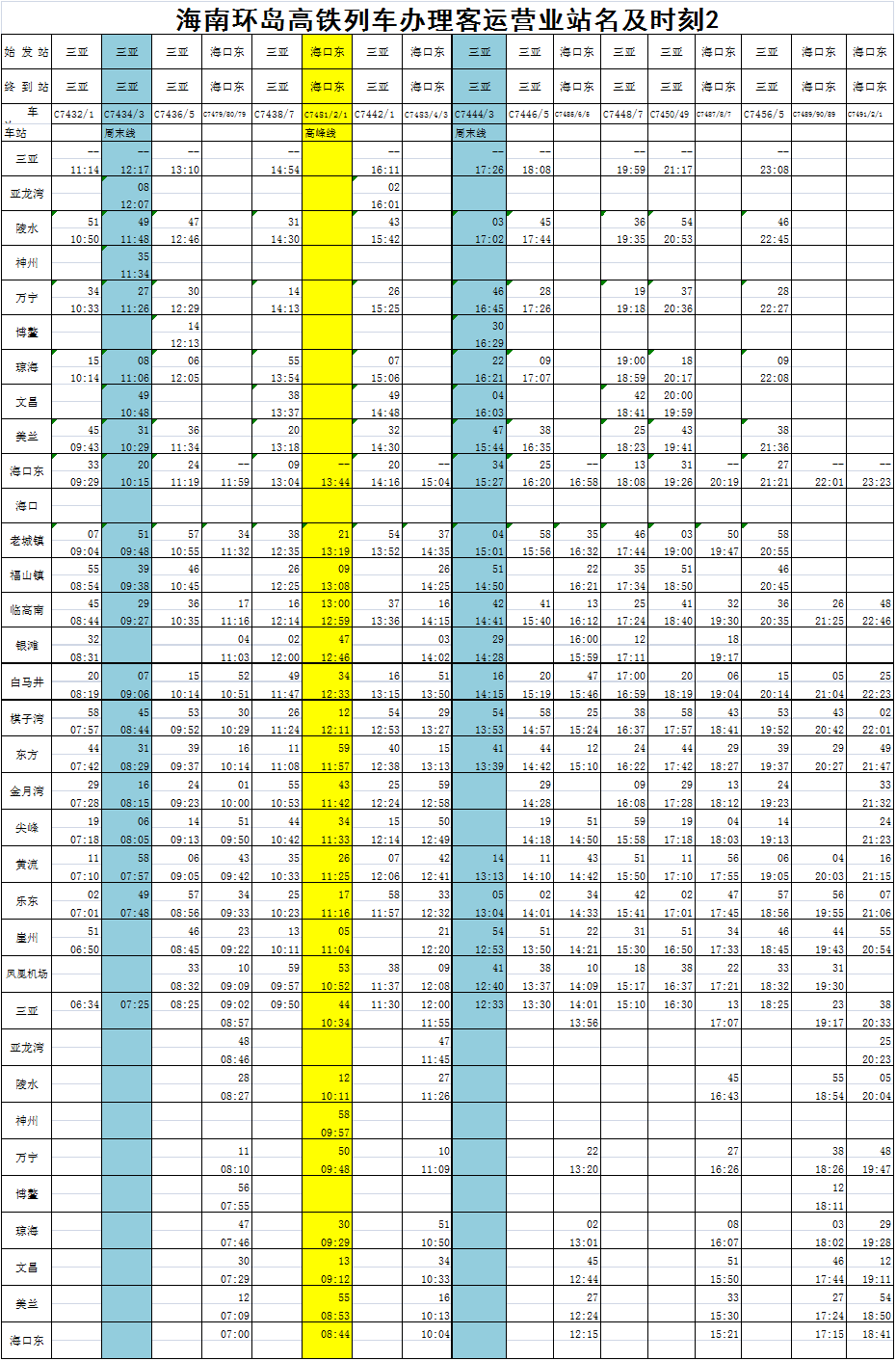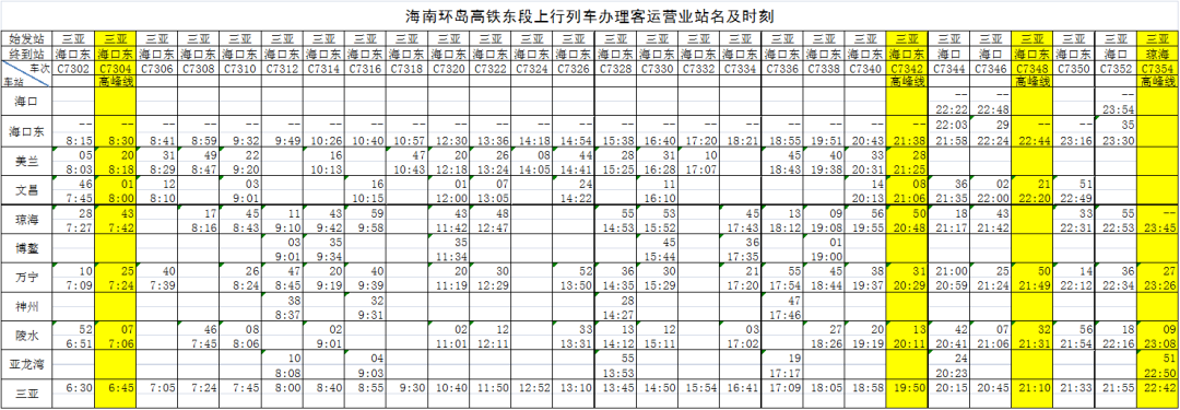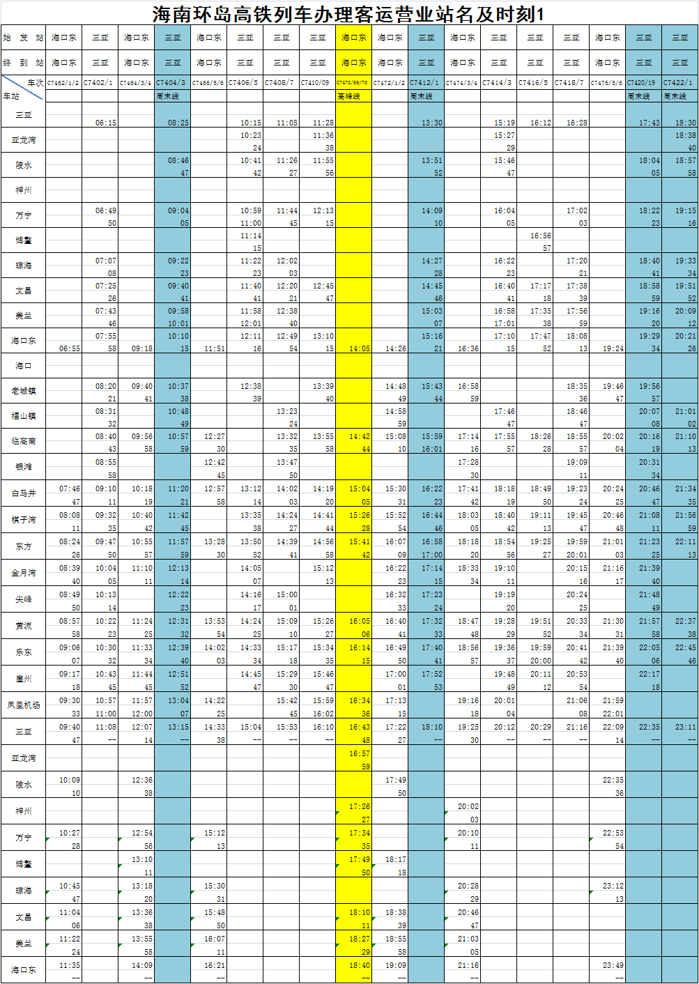 新海南客戶端、南海網、南國都市報7月9日消息(記者 王小暢 通訊員 符轉)9日,記者從海南鐵路海口車務段了解到,為更好滿足旅客出行需求,海南環島高鐵、海口市郊列車將于7月10日零時起實施新列車運行圖。