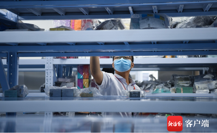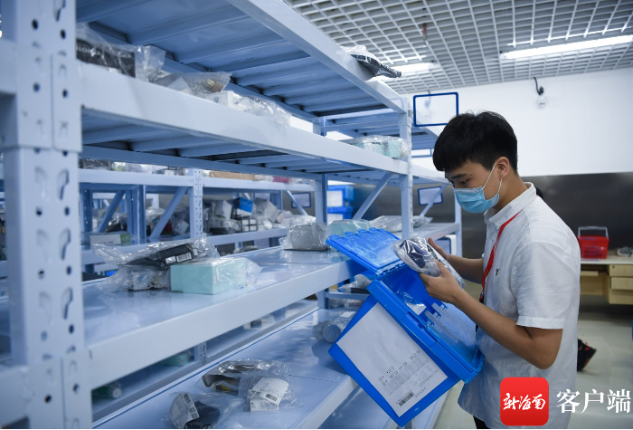 7月10日,三亞鳳凰國(guó)際機(jī)場(chǎng)新增的免稅提貨點(diǎn)啟用,工作人員在清點(diǎn)免稅商品。記者沙曉峰攝