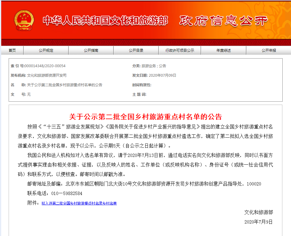 按照《“十三五”旅游業發展規劃》《國務院關于促進鄉村產業振興的指導意見》提出的建立全國鄉村旅游重點村名錄要求,文化和旅游部、國家發展改革委聯合開展第二批全國鄉村旅游重點村遴選工作,確定了第二批擬入選全國鄉村旅游重點村名錄鄉村名單,現予以公示,公示期5天(自公示之日起計算)。