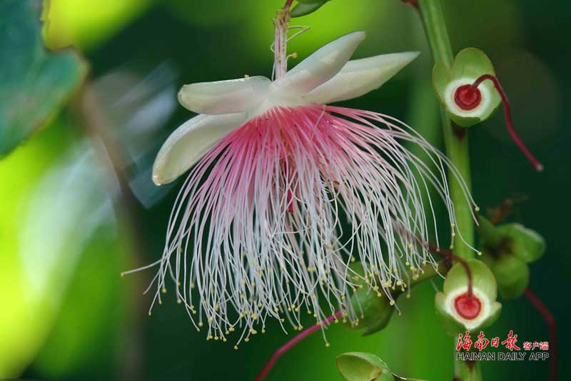 走在玉蕊林中,高大盤曲的玉蕊樹姿態優雅,每一根樹枝上都有一枝或多枝花序,長長的花序像藤條一樣垂吊下來,開花時,長長的花蕊突然從花苞中炸裂,探出虬曲的淺粉色花絲,彎彎曲曲的花絲逐漸延展伸直,一朵朵粉雕玉琢的瓊蕊瑤花流蘇般串串搖曳在風中,美不勝收。