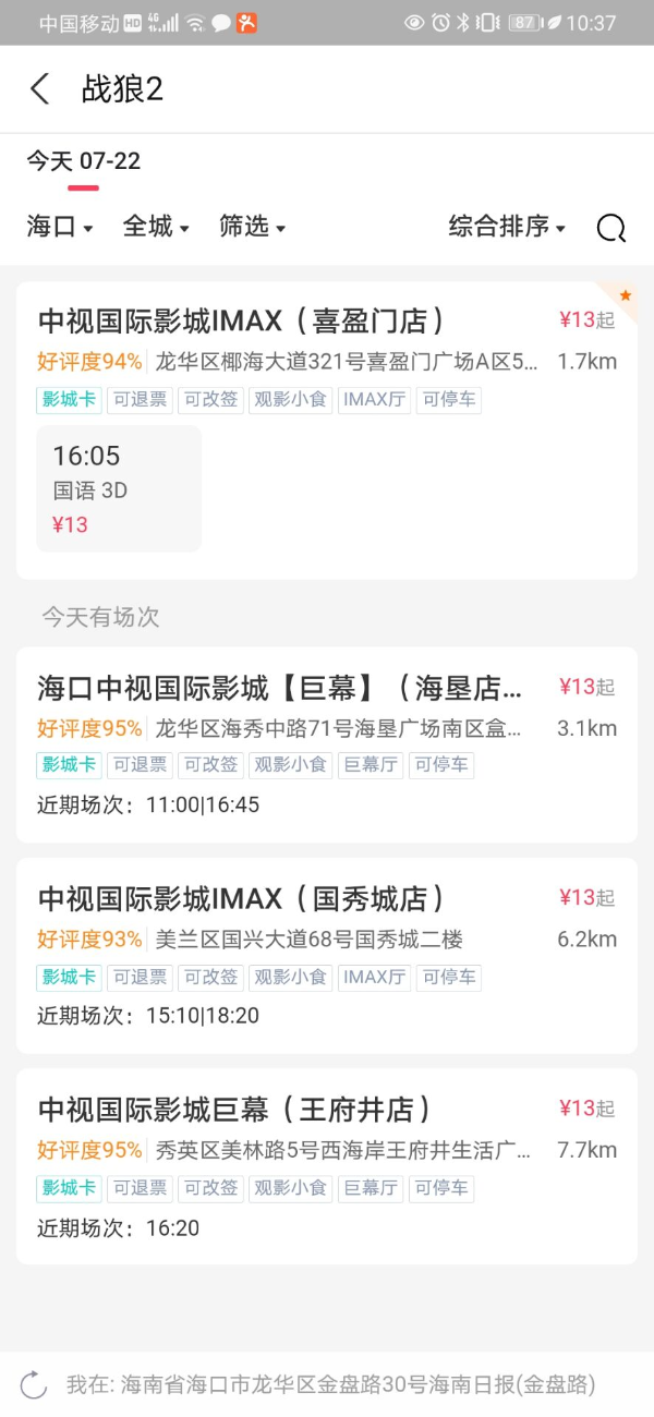 海口這四家電影院已可網上購票。