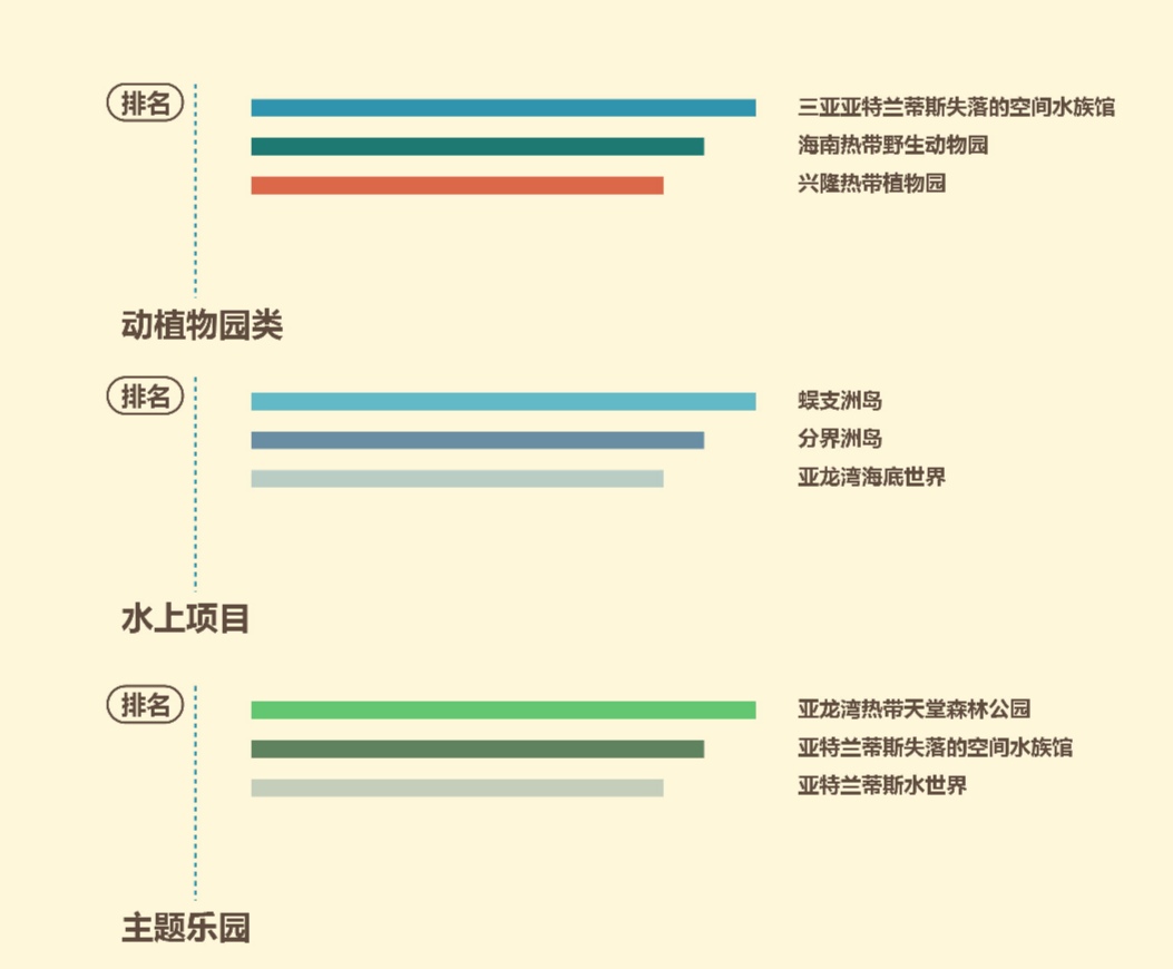 海南旅游資源豐富,動植物園和主題樂園都吸引了大批游客。《報告》顯示,動植物園類旅游項目中,三亞亞特蘭蒂斯失落的空間水族館、海南熱帶野生動物園、興隆熱帶植物園排名居前;蜈支洲島、分界洲島和亞龍灣海底世界的水上項目最受歡迎;亞龍灣熱帶天堂森林公園、亞特蘭蒂斯水世界在主題樂園中最具人氣。