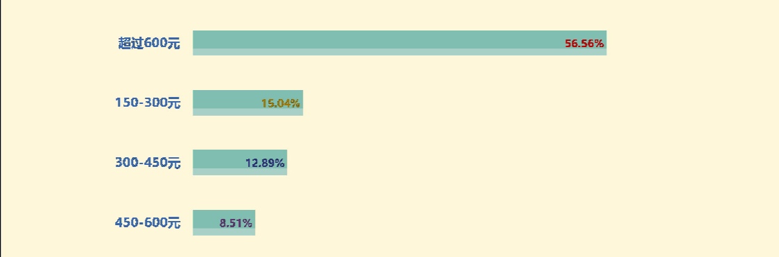 《報告》對在海南旅游的游客選擇酒店的消費水平調查顯示,選擇超過600元每晚的比例最高,占比56.56%;選擇450——600元每晚的比例有8.51%,兩者相加占比超過65%;150-300元每晚占比15.04%;300-450元,占比12.89%。