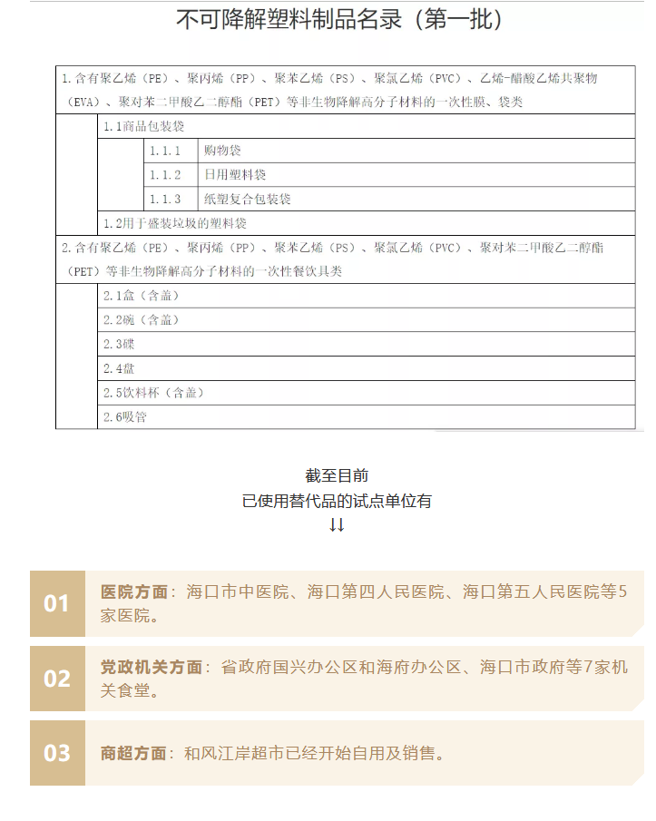 根據禁塑工作要求,上述試點行業要對被列入《海南省禁止生產銷售使用一次性不可降解塑料制品名錄(第一批)》的塑料膜袋、餐具等2大類8小類一次性不可降解塑料制品說“不”,以負面清單的形式拒絕“白色污染”。