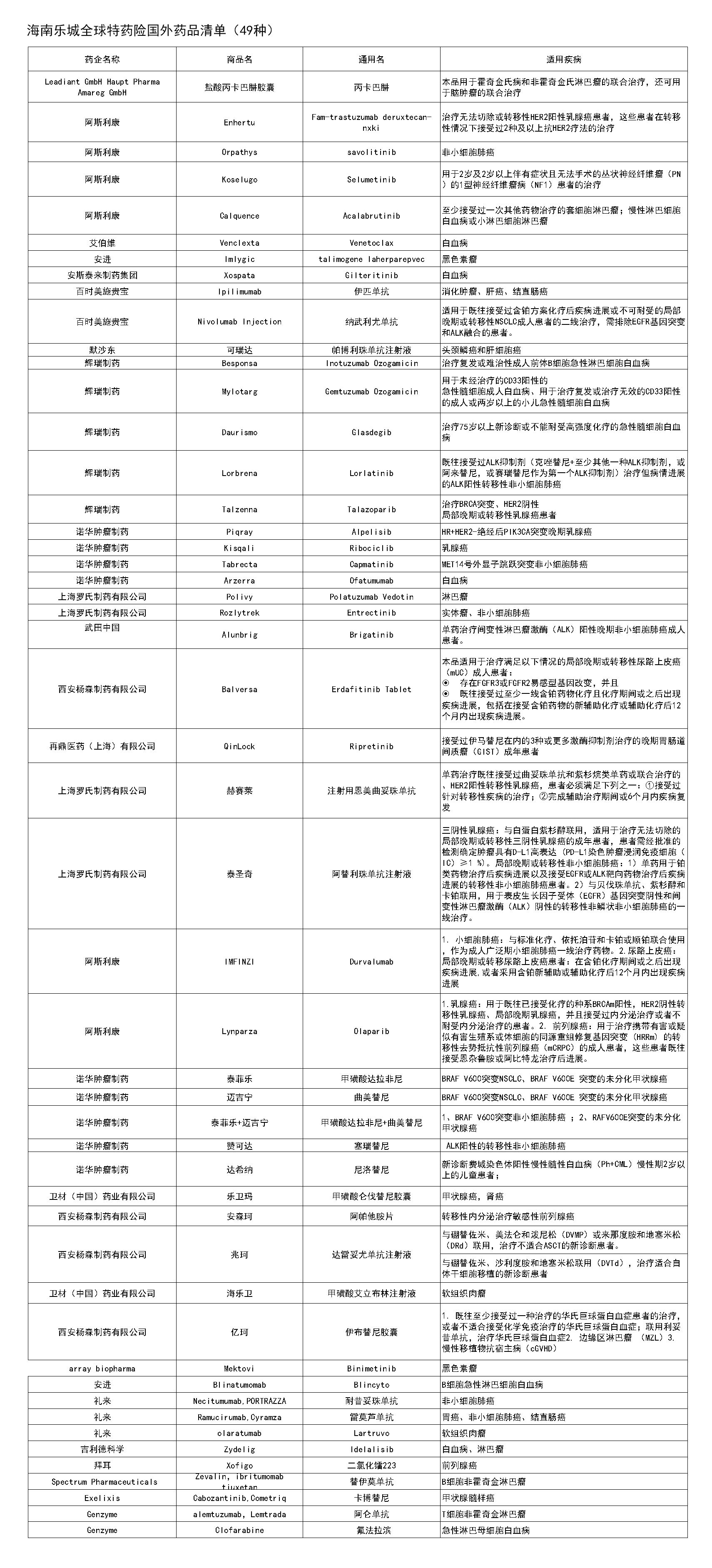 附:海南樂城全球特藥險藥品清單