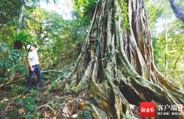 還未深入百花嶺景區,采訪團成員便感受到了熱帶雨林的神秘與魅力:景區大門處,屹立著一棵樹齡逾百年的高山榕樹,樹高30米,樹冠碩大,樹幅面積達200余平方米,不斷衍生的榕須從樹上垂下,互相纏繞,最后落進土里,一樹成林,不時有松鼠從枝干間快速閃過,發出梭梭的聲響,可循聲覓去,它卻已不見蹤影。