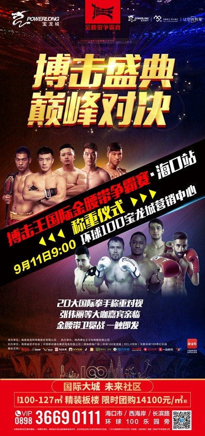 搏擊王金腰帶爭霸賽??谡举惽胺Q重儀式將在環球100寶龍城營銷中心舉辦。