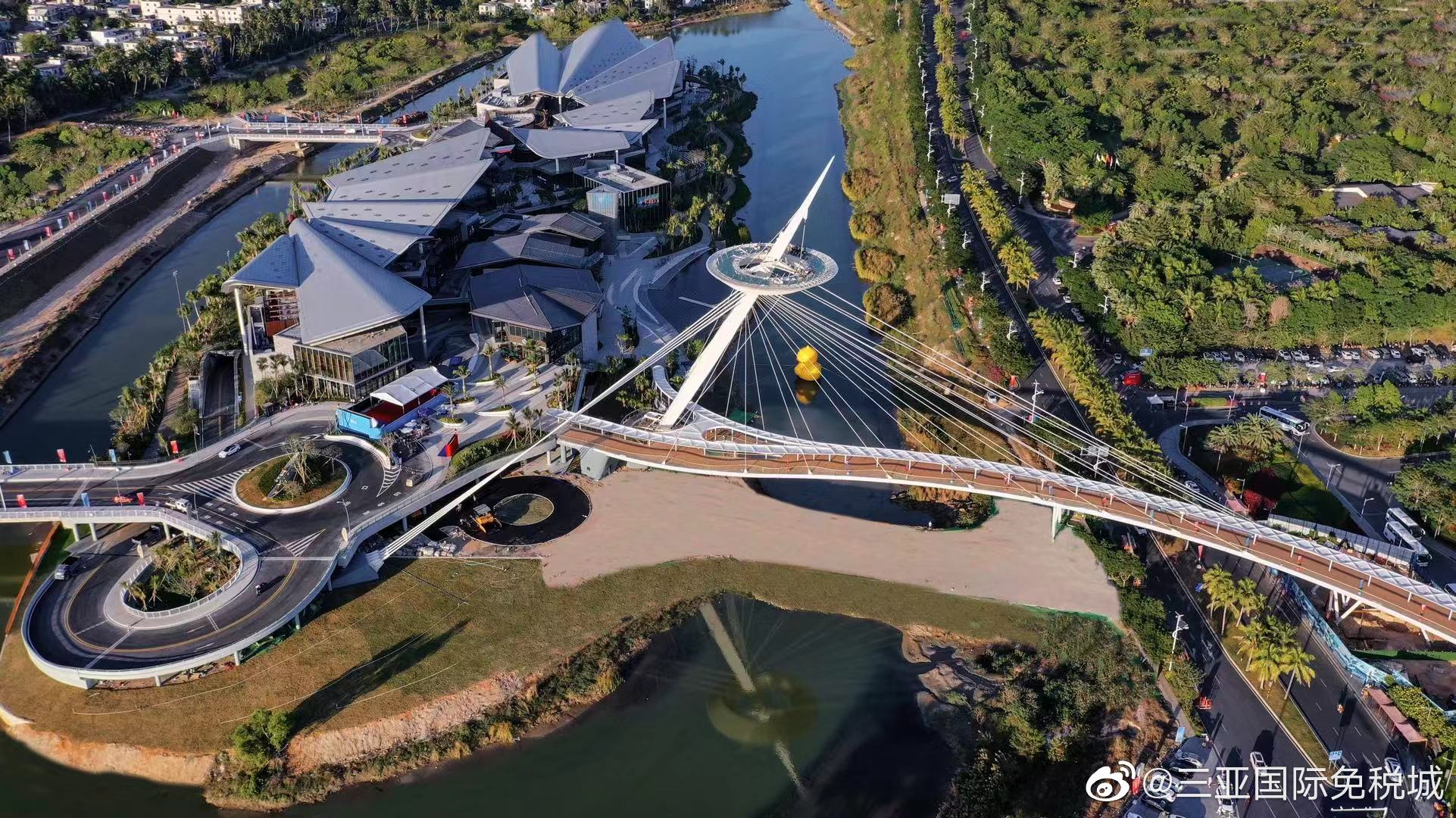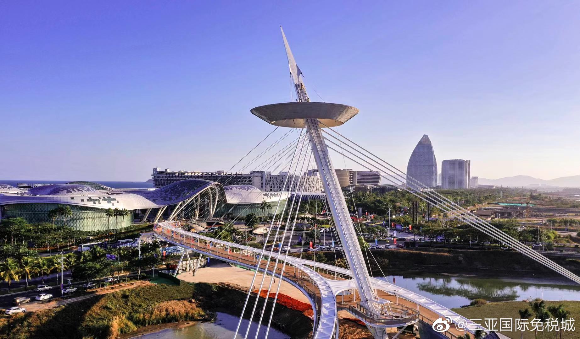 三亞免稅城二期的商業街由世界頂級設計團隊——英國貝諾建筑設計,整棟建筑宛如鑲嵌在沙灘上的貝殼。吸引眾多網友前來拍照留念的地標性建筑“云戒”橋,由法國盧浮宮玻璃金字塔設計者—建筑大師Dutton親自設計,是目前世界唯一的獨塔萬向鉸斜拉上人步行景觀橋,“云戒”橋落成后即成為三亞一張亮麗名片。