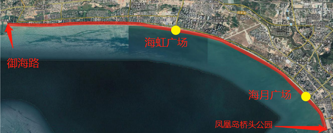 三亞灣功能提升項目鄰近三亞市中心,三亞灣路南側綠化帶,西起御海路東至鳳凰島橋頭公園(御海路—海坡六橫巷—海虹廣場—海月廣場—鳳凰島橋頭公園)。總長約15公里,平均寬度約為50米。總規劃面積為1125畝(75公頃),屬濱海帶狀公園。