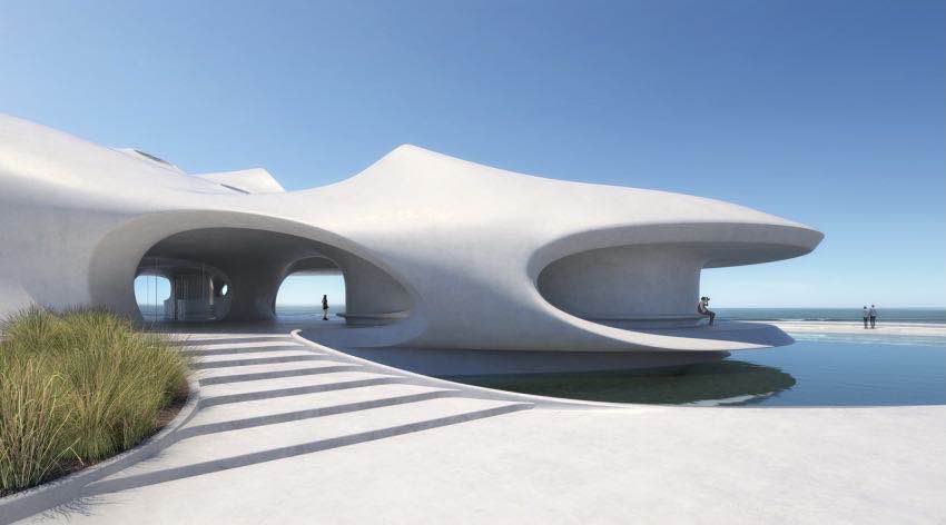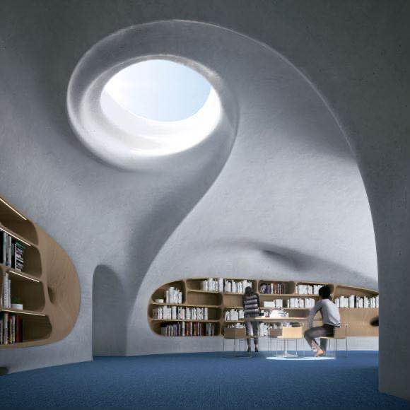 “云洞圖書館”的建筑靈感其實是來源于蟲洞,一個時空的概念,打造的不僅是蟲洞外形,也是類似于蟲洞的空間,讓人在空間里面有穿越時空和超越現實的感覺。整個建筑是曲面的、復雜的造型,大大小小的蟲洞就像多維的時間隧道,整體是非常有趣味而且神秘的空間體驗。
