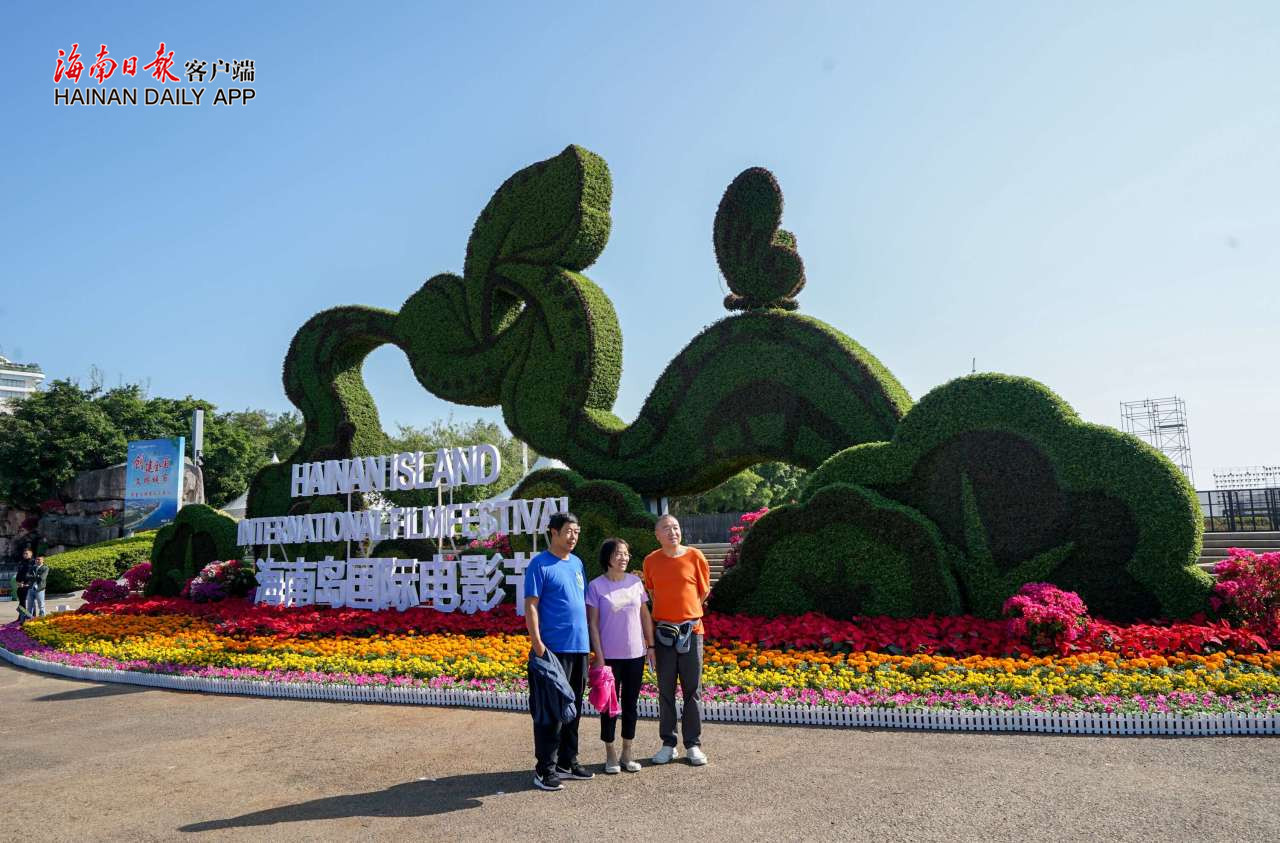 12月3日,在三亞市海棠廣場(chǎng),游客在第三屆海南島國(guó)際電影節(jié)花壇前合影。 本報(bào)記者 武威 攝
