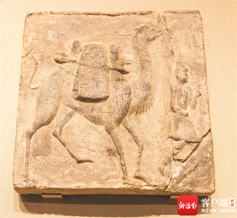展出的胡人牽駝磚(唐代)。海南日?qǐng)?bào)記者 宋國(guó)強(qiáng) 攝