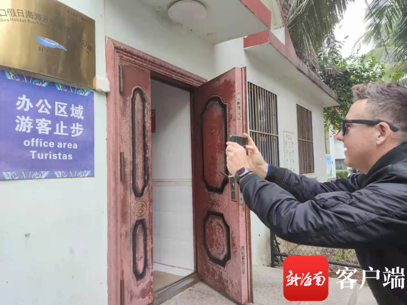 每路過一處指示牌,Tommy都會仔細閱讀上面的英文。在海口假日海灘開發管理有限公司的入口處,張貼著一張“辦公區域 游客止步”的提示,下方的英文是“office area Tourists”。Tommy看到后立即開始了糾錯,“忘記翻譯止步了,而且這就是一個字一個字地翻譯,很不地道。英語表達中STAFF ONLY就可以表達出員工通道、游客止步的意思。”工作人員聽到后,表示會盡快更換有正確翻譯的提示標語。